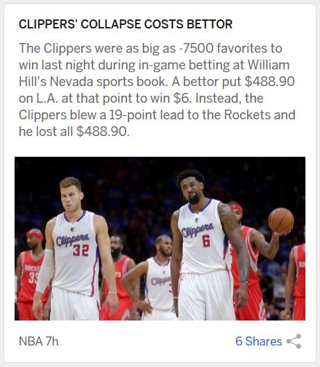 The Clippers were as big as -7500 favorites to win last night during in-game betting at William Hill's Nevada sports book. A bettor put $488.90 on L.A. at that point to win $6. Instead, the Clippers blew a 19-point lead to the Rockets and he lost all $488.90.