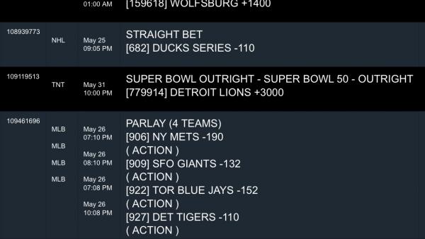 | 311126170-1 | 5/26/15 2:24pm | $25.00 | $2023.50 | Pending | 4 Team Parlay |