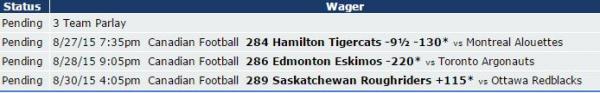 Concerning the different types of underdog “targets” I keep referring to, I can see a specific audience today and especially one tomorrow. I have constructed a moneyflow parlay that takes these bettors out all in anticipation of the Saskatchewan upset. It seems like a bunch of hoopla to protect a little Saskatchewan upset, but we are nearing the end of the first half of the season and clearly plenty of upsets have paid this year so far.