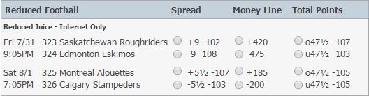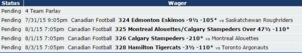 I am picking up the Calgary Stampeders -200 over the Montreal Alouettes even though this price could get a little better. I can actually see it getting worse as this line could hit -5.5, having nothing to do with reacting to bets.
