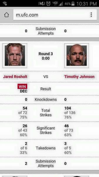 #153We just rewatched round 2...zero chance that Iranian won. He clearly lost the 1st. One of the worst decisions I've seen. 1 Sherdog judge had it 30-27, 2 others had it 29-28 Johnson. MMAJunkie had 30-27 Johnson.Comment -