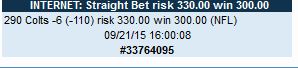 07:39 PM[Ticket #: 225987703] PARLAY (4 TEAMS) 09/20/2015 @ 08:40 PM NFL [288] GREEN BAY -170 09/21/2015 @ 08:30 PM NFL [289] TOTAL o45-140 (B+1.5 )