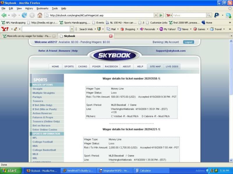 So let me get this str8 .................. Patty you bet on the Nats 3 str8 days for a total of over 7 dimes and presumably are gonna lose all 3 now with that big hit my Ross. Let me just say this. Guys who wanna do this for a living and wanna live in LV don't do what you just did this past weekend,and the reason I say that is because you had told me not to long ago your moving to LV in hopes to conquer the sportsbooks out there. Now betting on a 1-10 team vs a 10-1 team 3 str8 days is just fuking sick dude, dope heads DO what you just did my son ........................ un fuking real !
