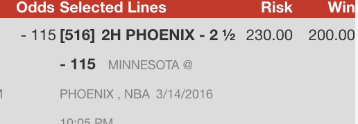 #12366994119-2 3/14/16 11:47pm $100.00 $280.00 Pending 3/14/16 10:35pm NBA Basketball 514 Utah Jazz 2nd Half +280* vs Cleveland CavaliersOriginally posted by CanuckGPost a ticket and a pic of the broad.