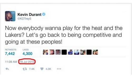 #148I think it's pretty clear now that KD threw game 6 of the WCFs. I said it than and I believe it even more now. It's not like OKC isn't stacked with talent themselves. Only logical reason is Russ made it clear to him that he wasn't staying after this year either, so he might as well bolt for the best situation now.Comment -