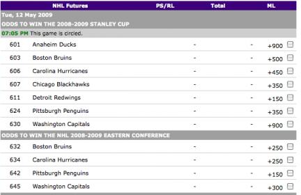 #25pens r favored because i believe they won last years eastern confrence finals, and out of the 4 teams left int he eastern conference..they are the only ones who made it this far and beyond, books are assuming the penguins will do it all over again...