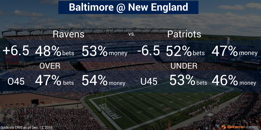 Spread action split 50/50 on Ravens (+6.5) @ Patriots. However 65% of $$$ on Over 44.5. Odds> (link: http://bit.ly/18q9SG8) bit.ly/18q9SG8