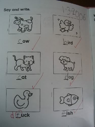 AAO bought IVAN a picture spelling book in hopes that his english would improve. he is working on it meatball..