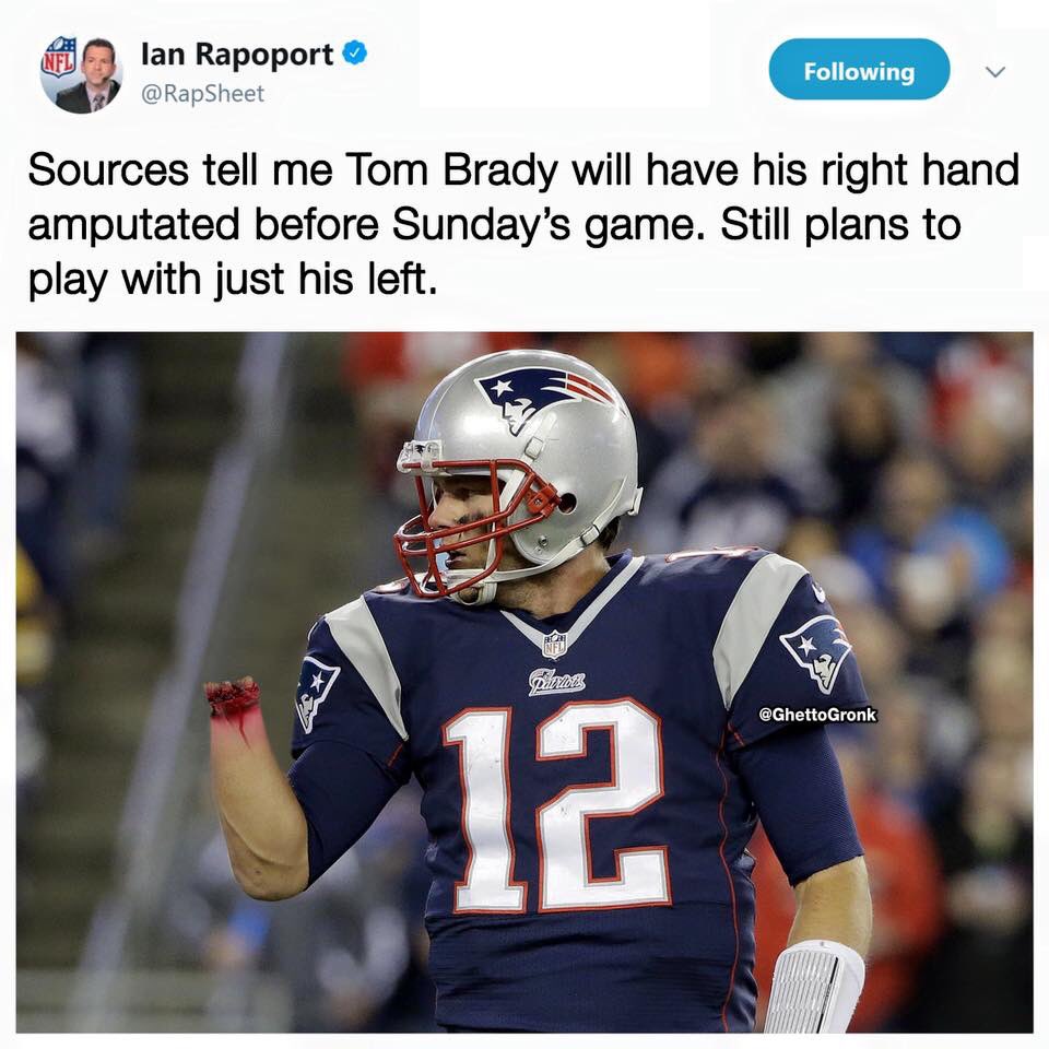 #40Gutted for Brady. Saying now he’s questionable and status more likely to go doubtful. Anyone know who the backup is for pats with Brady now unlikely ?Comment -