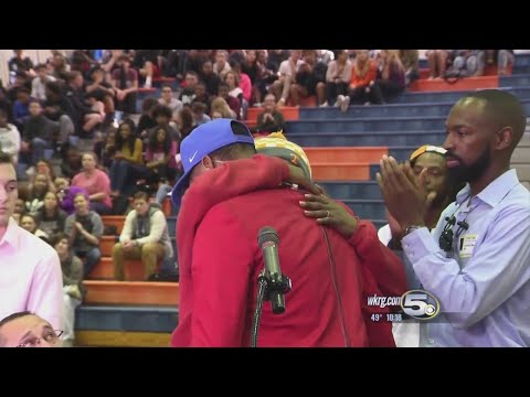 She had on an gear from 2/3 schools he had to choose from and he chose the one school she wasn't blasting