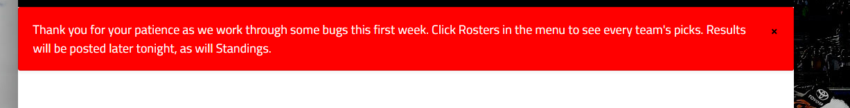 #41I think you just need to finish with all 5 picks to be in the money.. I'm down to 4 drivers..I'm done I think even if those 4 finish high up in the standing.. You lose a driver you lose out on big points period..