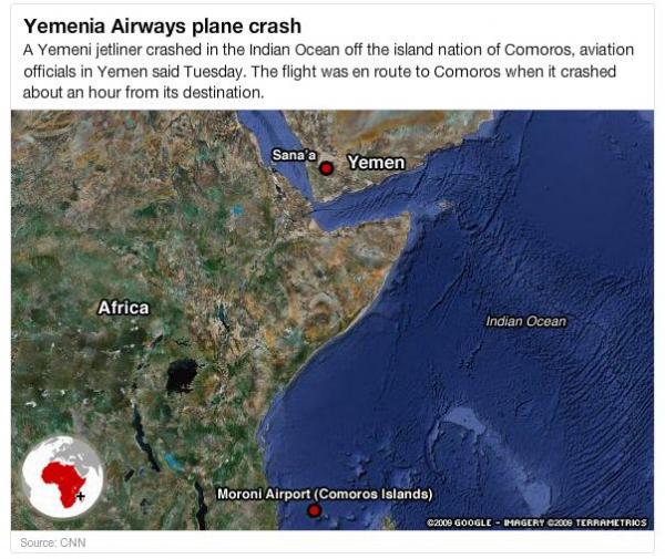 Yemenia Flight 626 left Sanaa at 9:30 p.m. for what was expected to be a 4½-hour flight. The airline has three regular flights per week to Moroni, off the east coast of Africa about 2,900 kilometers (1,800 miles) south of Yemen.