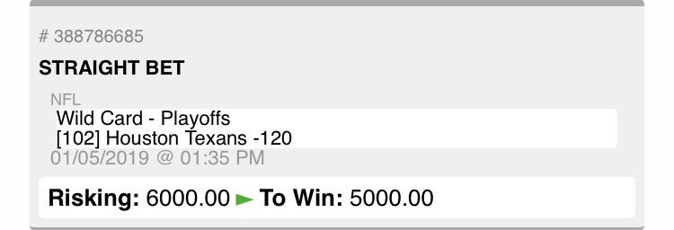 #1246Took them earlier in the week Shooter let’s both cash this shit !!!Originally posted by The ShooterWe’re going to get after her early and often today fellas ! I think IND has played very well to sneak into the playoffs, and for Texans we all know had one of the easiest schedules in the NFL. As close as this match up looks I am going to go with the home team. HOUSTON beinf 6-2 @ home and IND playing 500 ball at 4-4 on the road I think will be the difference maker in this one. It should be a close football game but I’m going with the Texans today ATS. GOOD LUCK FELLAS! Hop aboard if you want to, and fade away like that wanna be SHOOTER if that tickles your fancy. Ethier way I wish you luck!