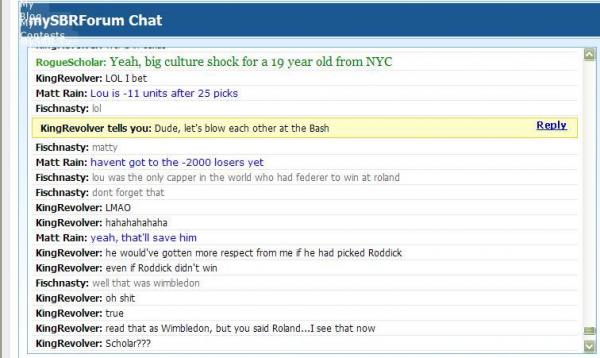 #58Pico, I'm just as surprised as you are. Seriously, I was having a tennis discussion in chat with Fisch, Matt and a few others and out of nowhere I get a PM from this guy wanting to hook-up at the Bash. At first I just ignored it because I can't stand the guy, but then I realized that it may come in handy when he sticks his foot in his mouth. Little did I know how right I was...Originally posted by StraitShooter90% of the guys dont give a shit about your problems..and the other 10 are glad you have them..Comment -