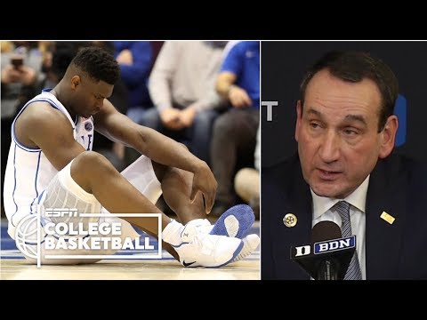 Not even a minute into one of college basketball's most anticipated games of the season between North Carolina and Duke, freshman phenom Zion Williamson goes down in a way not many have ever seen before. Williamson stopped on a dime and his shoe fell apart before either team scored a point, contorting his knee and falling to the ground. He did not return. Jay Bilas joins John Anderson and Steve Levy of SportsCenter to analyze the injury in depth and what it could mean for Coach Mike Krzyzewski's team moving forward (1:20). Following Duke's 88-72 loss to Roy Williams' Tar Heels, Coach K briefs the media, calling Zion's diagnosis a "mild knee sprain," (3:55) while teammate RJ Barrett discusses with reporters what the Blue Devils lack without Zion in the mix (4:55).
