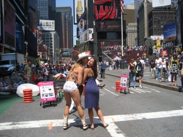 #7Woman gets kissed by gimmicky Naked Cowboy guy and declares it greatest moment of her life since some guy gave her a "shout out" in a video on a posting forum.Comment -