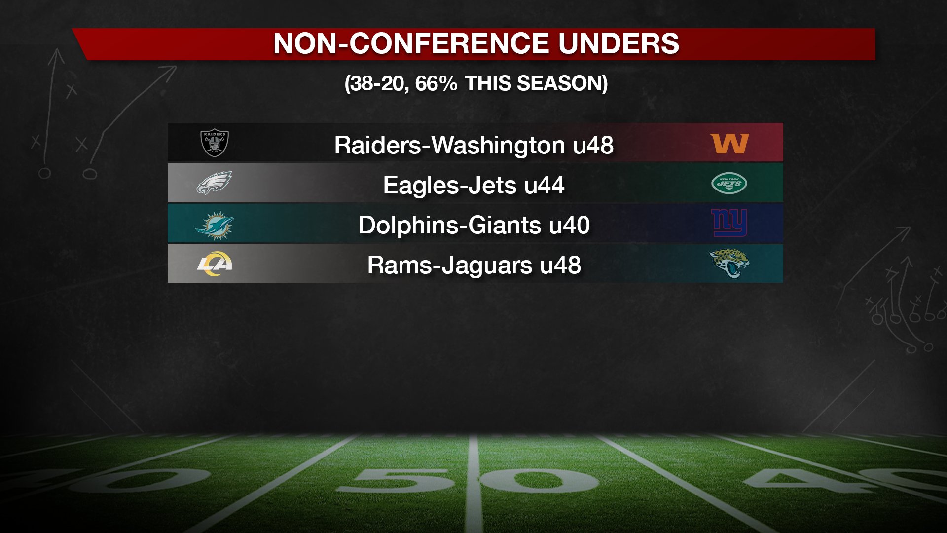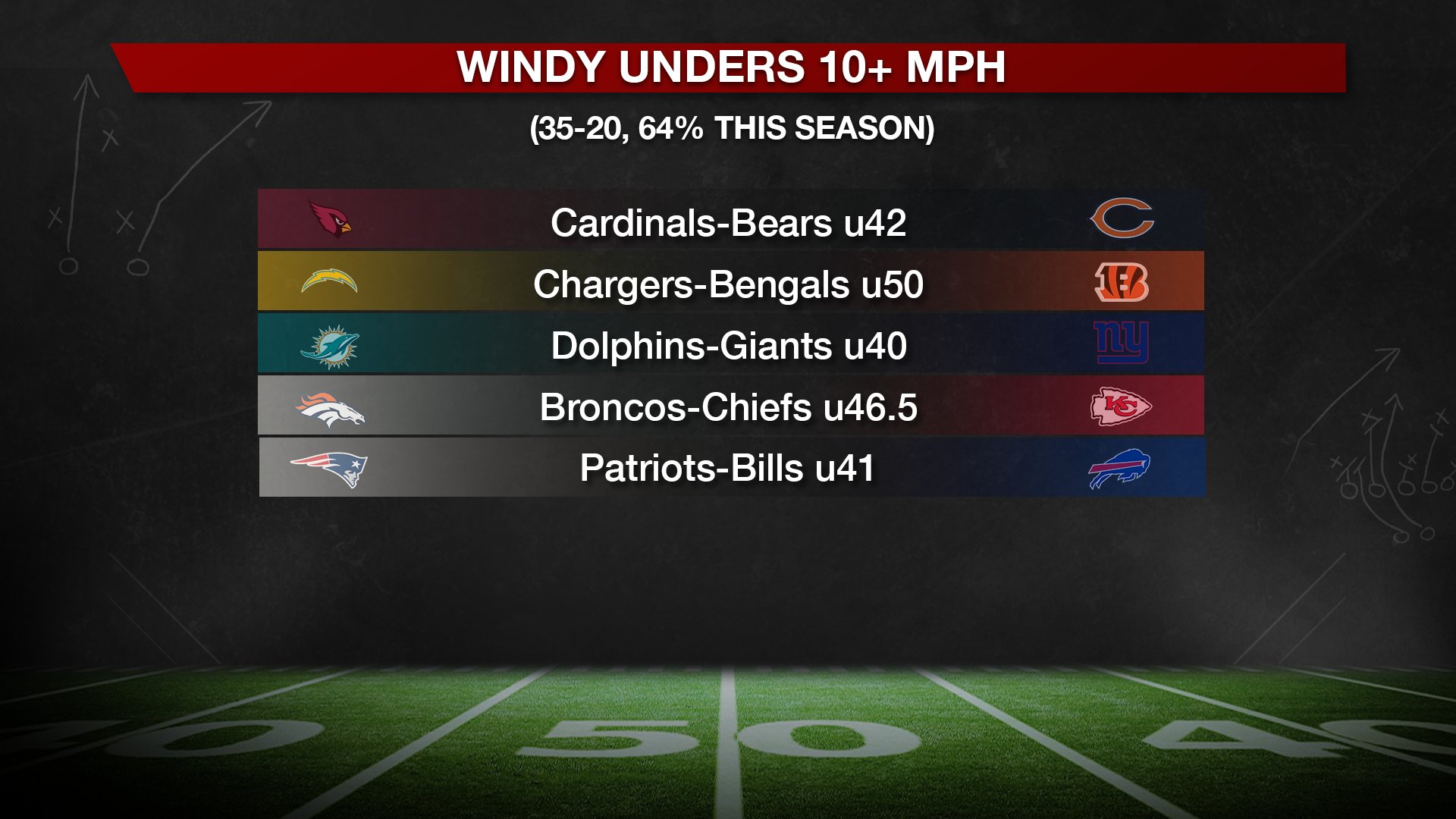 #500NFL One edge to keep an eye on is Unders. The Under went 9-5 in Week 13 to improve to 111-82 (58 percent) on the season. When the total falls at least one full point, the Under is 52-35 (60 percent). Nonconference Unders are 41-21 (66 percent) and windy Unders (10+ mph) are 38-21 (64 percent). Late-season divisional Unders are 57 percent over the last decade. Since Week 11, divisional Unders are 12-4 (75 percent).Comment -