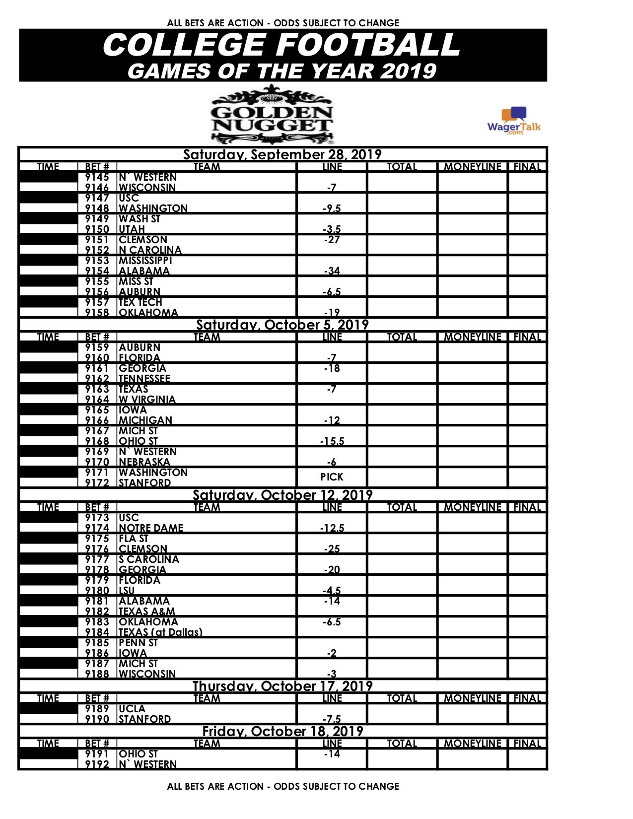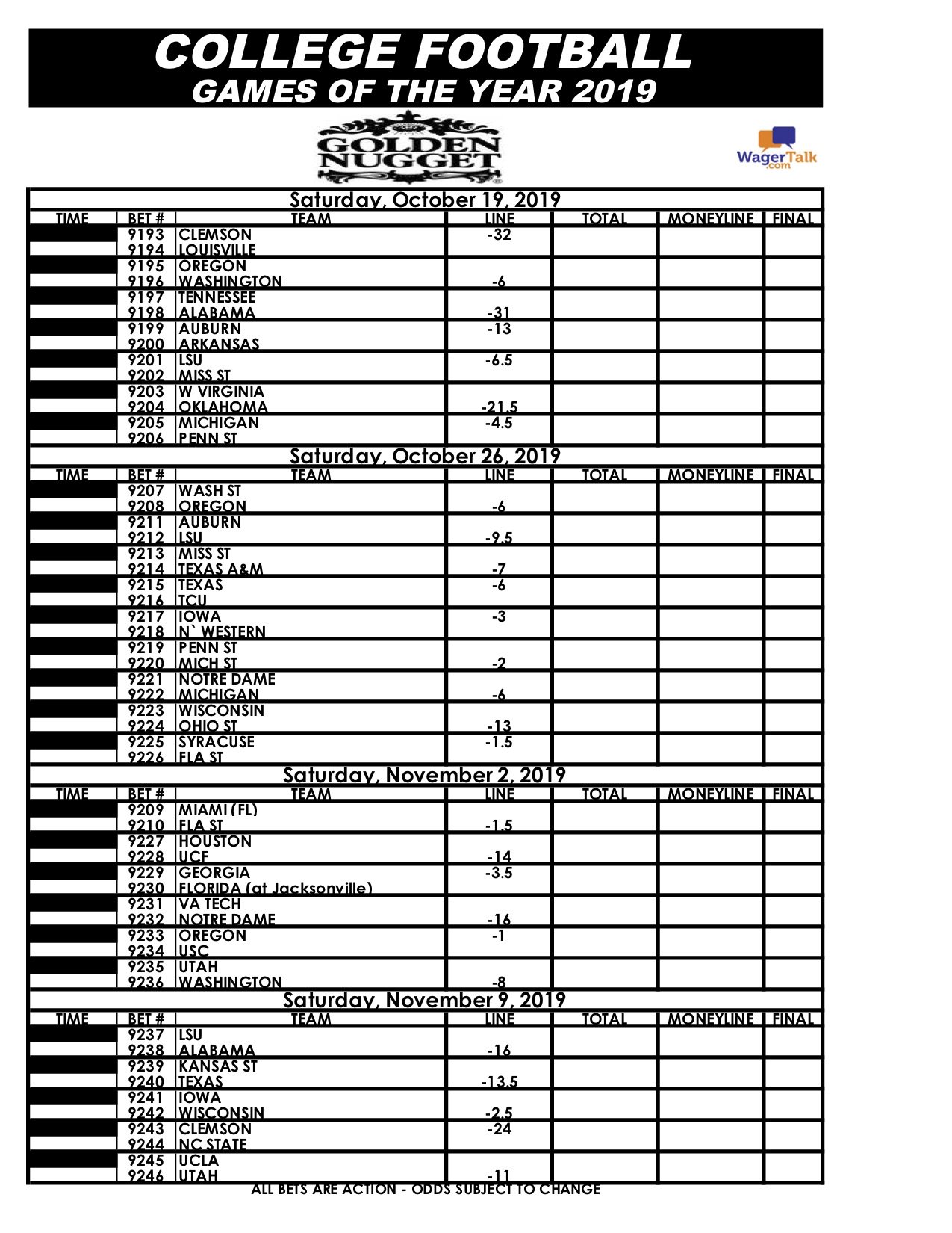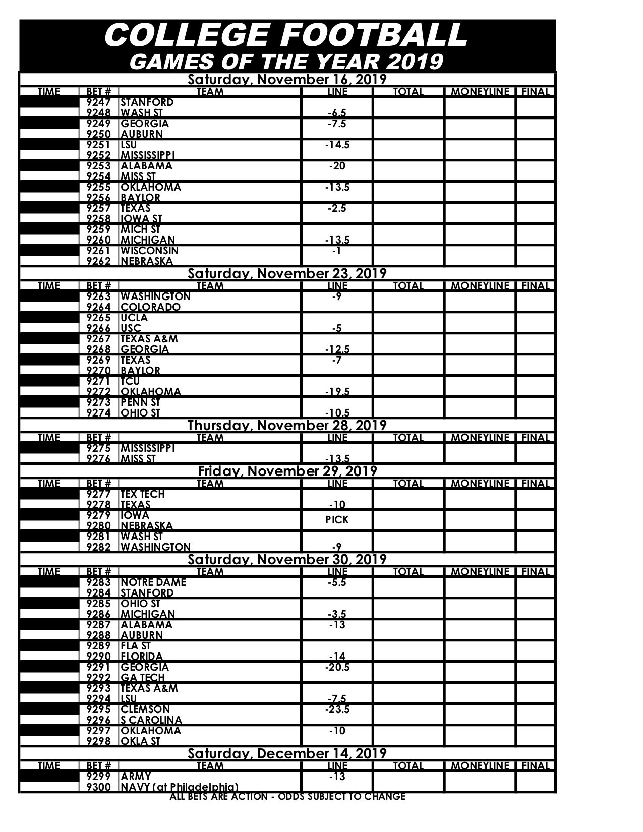 #10To answer a few questions, first, the limit is $1000 per game, up to 5 games. Then you go to the back of the line. Sam, the object of the GOY's is for the Nugget to take in money early, and use it for whatever purpose they choose. The more popular the game (USC-Notre Dame, Ohio State-Michigan, OU-Texas, popular conference games, etc...) the more money they hope to take in. The danger with this for the books is that they could get nailed with some big middles. Example. Army does not have the season that many expect (4 losses) and Navy does a bit better than expected (5-6 wins). That plus the fact that 7 out of the last 8 games have been decided by 7 points or less, and the last 3 games have been decided by 4 points or less, could send the line crashing down from 13 to 5 or 6 points. Those who took Navy + 13 now have a huge middle opportunity. Middles can pay out 20-1. Wager $110.00 on each side. The worst you can do is lose $10.00 in vig, but win both sides and you win $200.00. It simply does not get any better than that.Comment -
