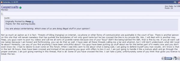 #2"Not as much an opinon as it is fact. Threats of killing (hanging) on internet, via phone or other forms of communication are puishable in the court of law. There is another person on this site that will remain nameless that has pushed the boundaries of not only good taste but he has crossed the line in my private life. Him, I will deal with in another way. Peep, you guys want to post my videos and call me all sorts of juvenile names because one of your "boys" didn't like being banned frm SBR, that is fine by me. If you all want call me names because I am honest and forthcoming, you can do that as well. I have seen all these threads calling me a liar and whatnot, but I still don't understand..what did I ever lie about? Honestly, can any of you find anything I have been untruthful about? You guys have been putting up stuff about me for the better part of 6 weeks now and you don't even know me. I had no desire to ever come on this forum. When I see links sent to me about what is being said, I am going to defend myself (any man would). All I know is that in the last 36 hours, lines have been crossed and instead of me answering you guys with offers to box it out, I am just going to handle it like a mature adult and go through the proper avenues. I am just giving warning in this thread, that is all. Some of you have crossed the line. I can take a joke, unfortunately some of you think that gives you licence to break the law."Comment -