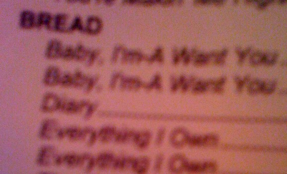 *Nothing looks interesting in here, female-wise. We go sit outside and find the big karaoke catalog on a table. We discover that Bread is a successful recording artist: