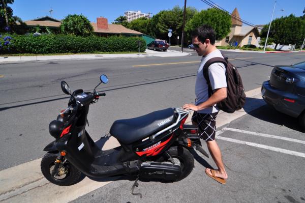 *Parking is scarce by the beach, so blitty proposes that we take his scooter. He quickly follows with "It's pretty gay, but you know..." I take a look at my proposed seat, which is barely larger than the YAMAHA logo: