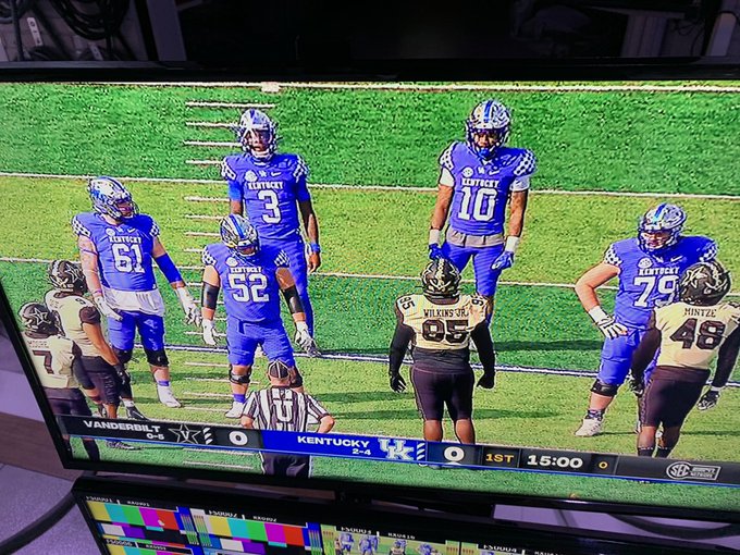 #7UK Football leaves the Left Tackle position open for the first play from scrimmage and takes a delay of game penalty in honor of OL Coach John Schlarman who passed away after his battle with cancer.