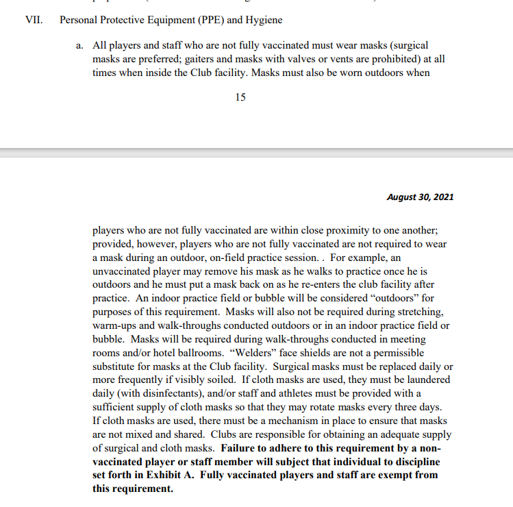 #37There is not a line in the NFL's protocols specifically about mask wearing during press conferences, but unvaccinated players are required to wear masks indoors at all times except while eating.