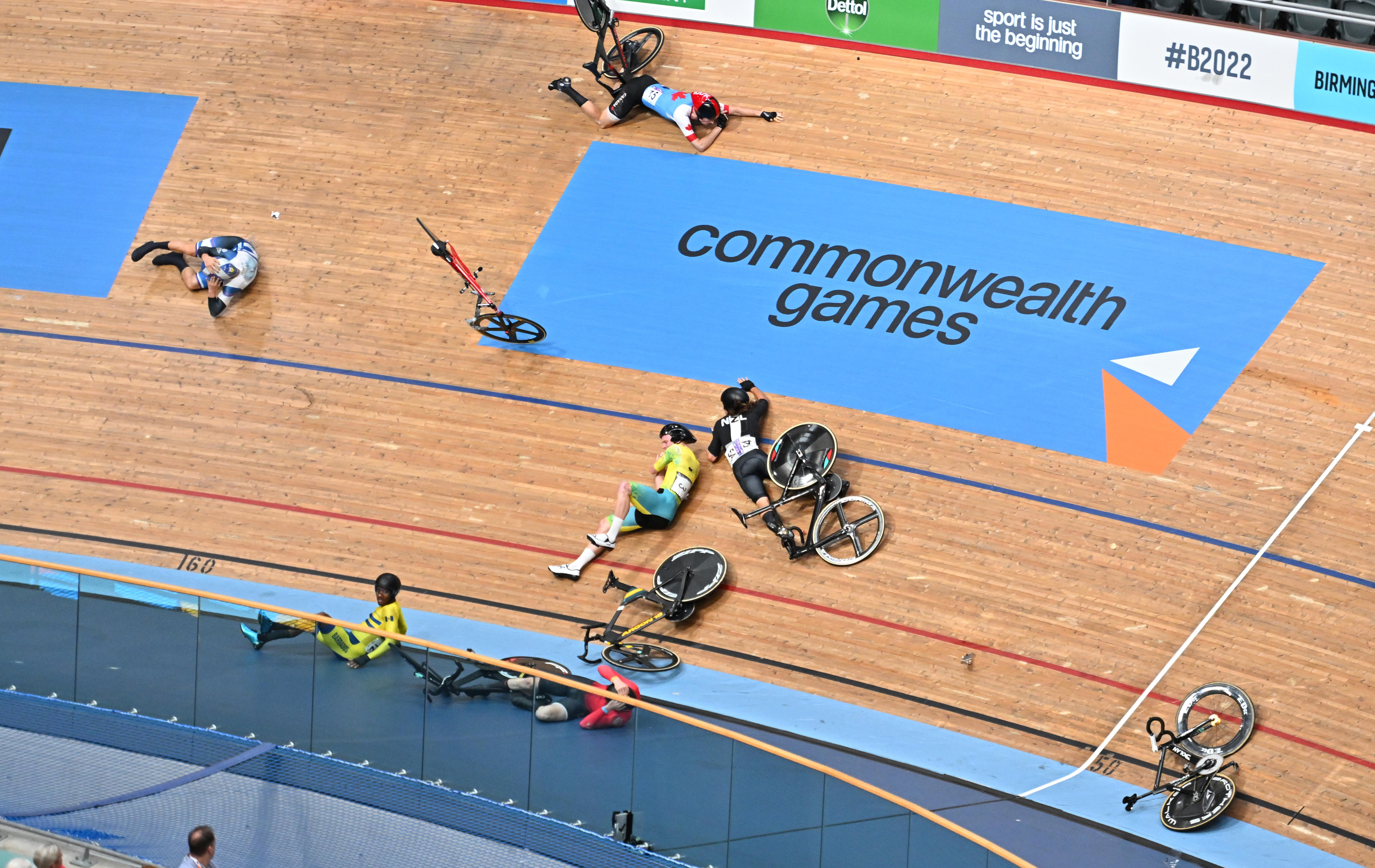 Three cyclists have been taken to hospital and spectators have been injured following a horrific crash during a heat of the men's scratch race at the Birmingham Commonwealth Games.