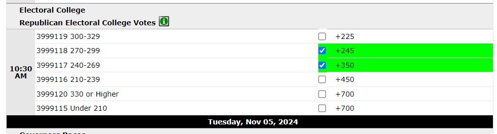 I like that +350 the most. It's almost like getting Harris at +350. I do also really like the +245. I recommend putting some money on both of these. I think there is a very good chance that one of them will hit.Comment -