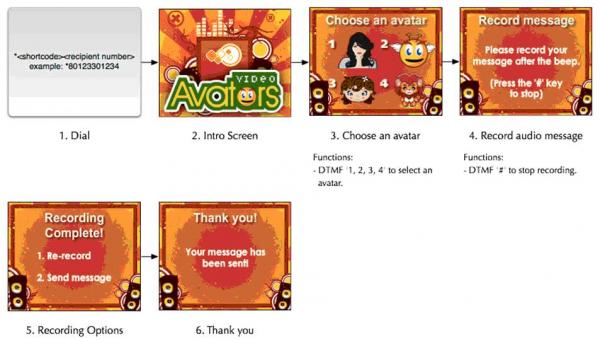 you dial the number, record a message and select an avatar. the recipient will get a video of a cartoon character speaking your message. the cost is the same as text sms. (5 seconds equals one sms cost).