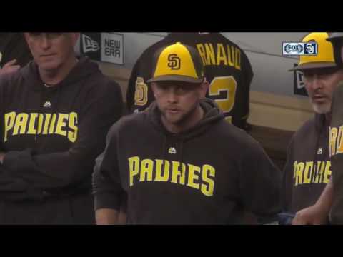 Wood stepped off the mound and began yelling at Pirela, which caused both benches to be warned in the bottom of the first. As both managers met after the first inning behind home plate, Green said something to Roberts and began to walk away, but Roberts followed, yelling, and bumped the San Diego skipper, causing both benches to rush out and step in between the two.