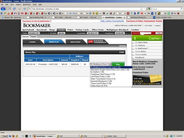 I did the CANT LOSE promotion, and i am trying to attack their online casino. i got a 100% casino bonus on a $500 deposit. now i have never played in any online casino before so i do not know what i am doing. the bonus comes with a 100X rollover. in other words i have to wager $50,000 in the casino to withdraw or transfer any money out of the casino.