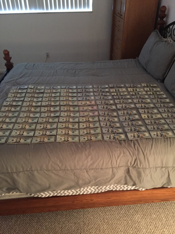 Here’s my 10K spread out on my bed in 10 rows. Note some rows have stacks of 20’s & 50’s in 100 amounts.