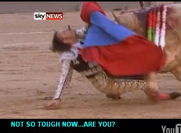 I don't even like bulls, don't care that they all end up fukkin dead in these bullfights, but it's just good sport for them to gore a bullfighter or two on their way out. Good for them. Take no prisoners, etc.Comment -