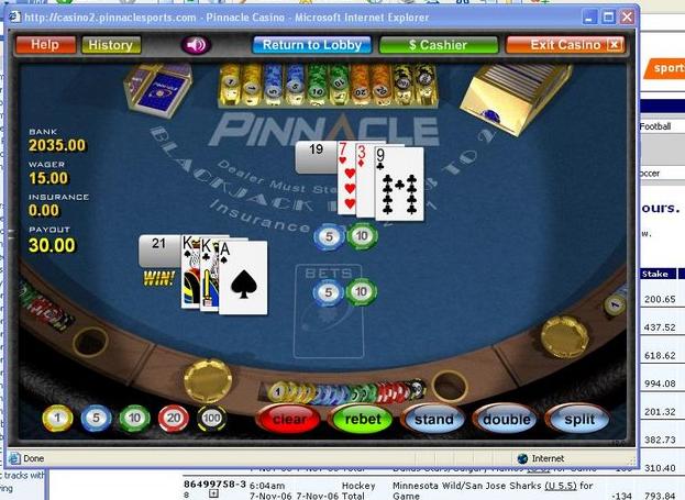 i think i have posted this picture before. this is a screenshot for one of the hands on pinnacle blackjack. here is the setup for the picture. i got a 20, dealer got 7 showing. i hit and got 21, dealer lost with 19.