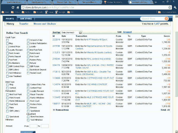 #223Can you give me an example of what you type in that should return results but doesn't? One of us can look at it here and see if there is an easy fix.Originally posted by Cookie MonsterLooks like I found the culprit. For some reason, some contest fees are listed in parentheses. They substract correctly from the points total, but in the points search function they are not counted. I had to cut and paste all my transactions into a spreadsheet to find this bug