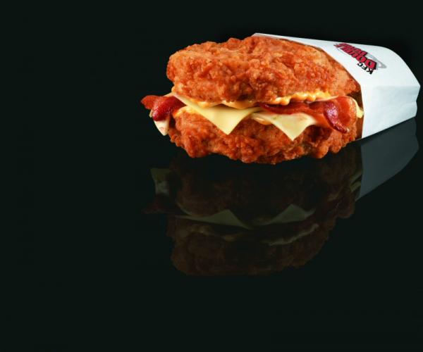 Renowned as the world's first-ever bunless sandwich, the KFC Canada Double Down boasts two pieces of deliciously seasoned Original Recipe boneless chicken, two pieces of bacon and processed Pepper Jack cheese — all topped off with the Colonel's savoury, secret sauce.