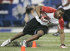 The other two top running back prospects, Rashard Mendenhall and Jonathan Stewart, solidified themselves as must-have top 20 players after clocking 4.45 and a 4.48, respectively. Stewart cranked out a defensive linemen-like 28 bench presses of 225 pounds, while Mendenhall wasn't any slouch with 26 reps. More importantly, Mendenhall led all the backs in the 20-yard shuttle with a time of 4.18. Overall, the running backs were a lightning-fast lot with five running sub-4.4s and looking like a faster, more athletic group than the Combine has seen in years, and then there was ...