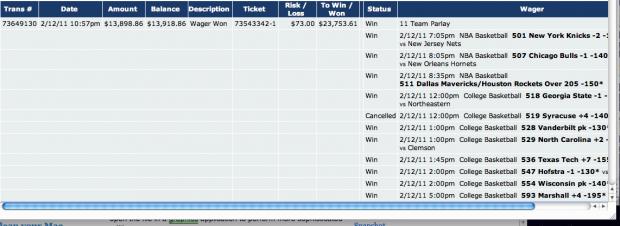 73543342-1 2/12/11 7:27am $73.00 $23,753.61 $13,898.86 Win 11 Team Parlay