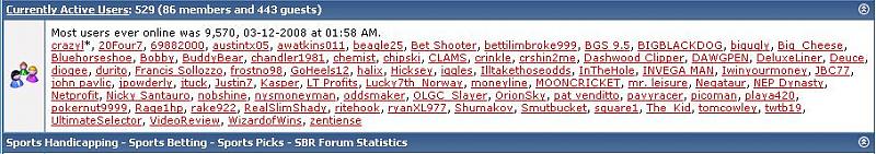 Anyone curious to how your forum stacks up to the others can check out the who's online activity log or look at the amount of new posts and threads in a set amount of time. Right now we are behind Covers and TheRX for forum activity and are on pace to be at #2 eventually. But "activity" isn't the only thing that matters on a good board. You won't see SBR rack up traffic from a nudie forum.