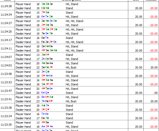 I've played online blackjack for 6 years now. 1 once won 12 in a row at Bodog and 1 time 10 in a row. So winning 10 in a row is rare.