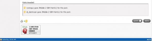 I sent Lou a PM already about the SBR Points Trivia and I don't have a screen shot of that. But I won the first round for 10 points and never got them. I didn't do a screen shot because, well, I didn't think I needed to.