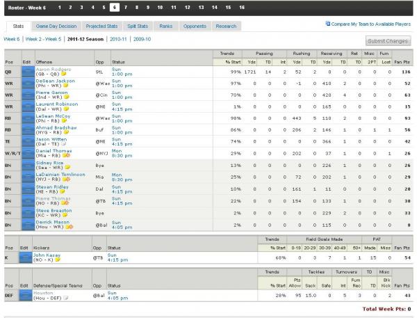 #819Thanks!Originally posted by Monitor-TanJust somethign to consider..Best had one beast run last week against the bears if you take that away it would've been slightly above average day.. Prior to that he's been a fantasy bust.. He's going up against one of the best run defense team.. He's in a team that doesn't need to run the ball clearly seen each week with stafford connecting with megatron and his TE.. There's not going to be a reason for Detroit to force the run game if it's not there when they know they have much more success airing it.. I'd look at some different angles to justify if you should start Best.. If not i'd stay away this week.. I think of your options Jordy Nelson is your best bet to give you a consistant # I wouldnt trust Holmes with that jets crappy offense against the dolphins coming off a bye.. I'd pick Jordy Nelson or colston.. but would consider Nelson.. Just a thought.. Best of luck this weekend!Comment -