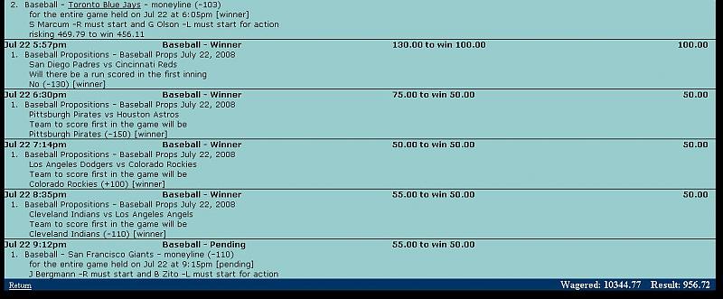 #13prop betting is pretty fun, all you have to do is to find out which SP sucks. always look for away team with close to even odds or plus odds because away team tend to score first....they have 3 outs advantage. this makes the game watchable...at least until someone scored a run.Originally posted by Bill Dozerhey now...don't hold out on us PicoComment -