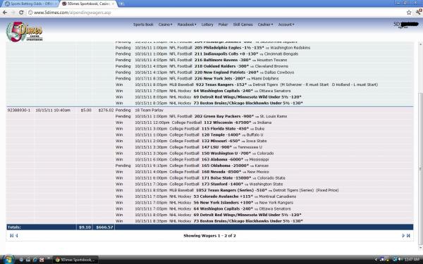 Today I really liked a few of the hockey games and liked the Rangers so I decided to parlay them with some heavy chalk college moneylines. I only risked $5 because I thought it had no chance of hitting (kind of a lottery bet). Anyways, all I need is Packers ML tomorrow (Oklahoma has this wrapped up) and I have won myself a few tanks of gas. I don't see a need to hedge with Rams moneyline. I don't normally play parlays but maybe I will start
