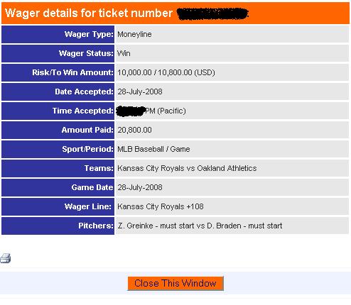 how do you have a 10,000/10,800 (USD) risk/win ratio, with kansas royals +108, and end up with a 20,800 amount paid..? Just curious
