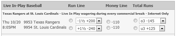 #121u think i dont know what a hedge is ???Originally posted by UpsetSpecial09Hedge implies coming away with a guaranteed profit or at least limiting your loss to a minimum. Here was the line during the last commercial before the 6th inning started. Taking either the over or under line would do nothing to ensure you anything.