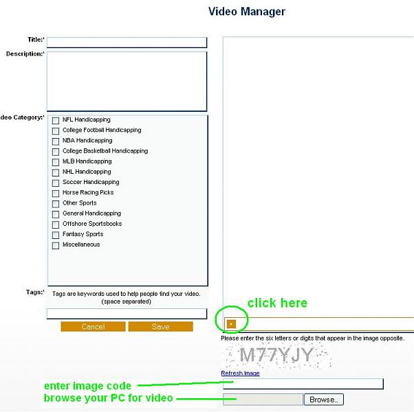 Login to the http://www.SBR.TV using your SBR Forum username and password. Click on "Upload Videos" ... you'll see a screen like the one below. For today, look near the bottom of the page and find the plus sign icon ("+") ... click that and follow the directions that appear.Comment -