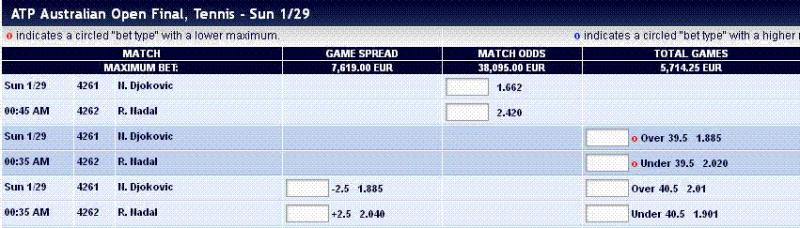 #15Originally posted by FourLengthsClearNo they don't. Both the Men's and women's finals will be traded continuously at Betfair with 100.2 - 100.3% (equivalent to -101). In terms of commission, well if you are the sort of guy who is dealing the EUR 120k bets, it is probably fair to say you would be at the lower end of the commission scale. At 3% for example, it would bring the effective Betfair odds down to an equivalent of -102.5 or -103.