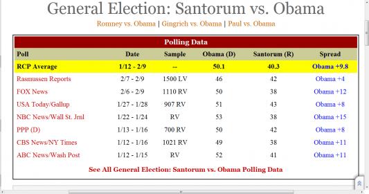 LOL. Santorum beats Obama in 1 out of the last 100 polls and suddenly he's "beating Obama head to head in the polls."
